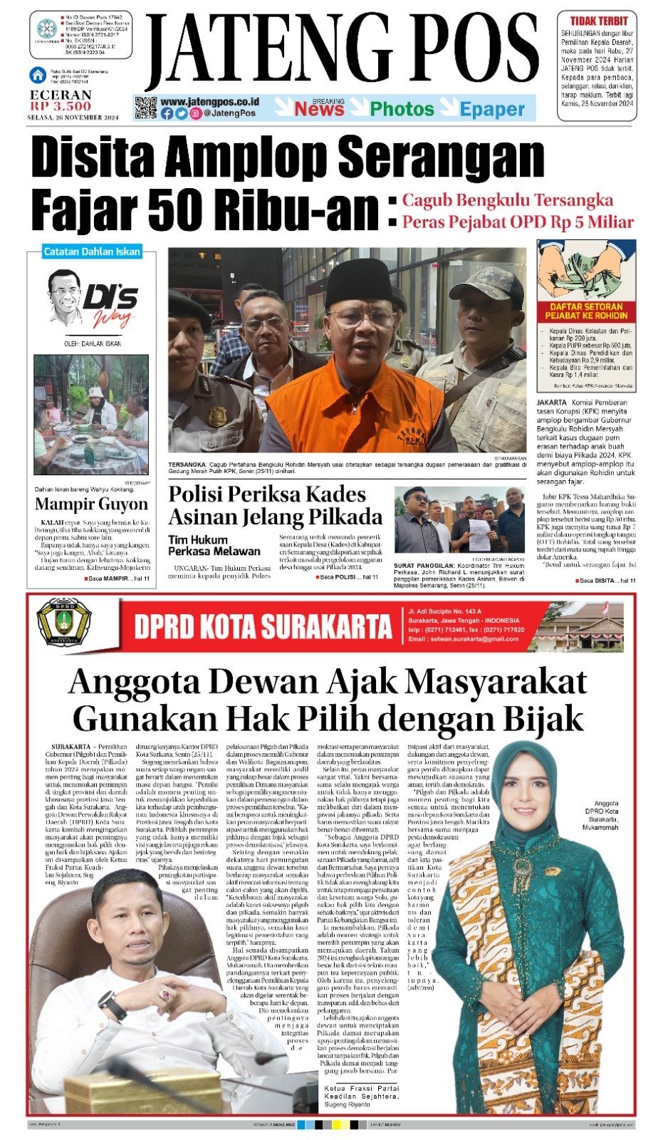 E-Paper Koran Jateng Pos, Selasa 26 November 2024 Admin: Redaksi Selasa, 26 November 2024 Bagikan Copy URL TERKINI Polrestabes Kawal Aksi Unjuk Rasa Anti Korupsi di Balai Kota, Berjalan Aman 24 Juni 2025 @18:11 BNNP Jateng Bongkar Jaringan Pengedar Narkoba di Tegal 24 Juni 2025 @18:02 Lebih dari 70.000 Mahasiswi Ikut Female Future Leader 1 24 Juni 2025 @17:57 Neo Sport Cafe CB650R Terbaru Tampil Makin Gagah dengan Teknologi Terkini 24 Juni 2025 @17:53 Pemprov Jateng Jalin Kerja Sama Kelautan dan Perikanan dengan Fujian 24 Juni 2025 @17:50