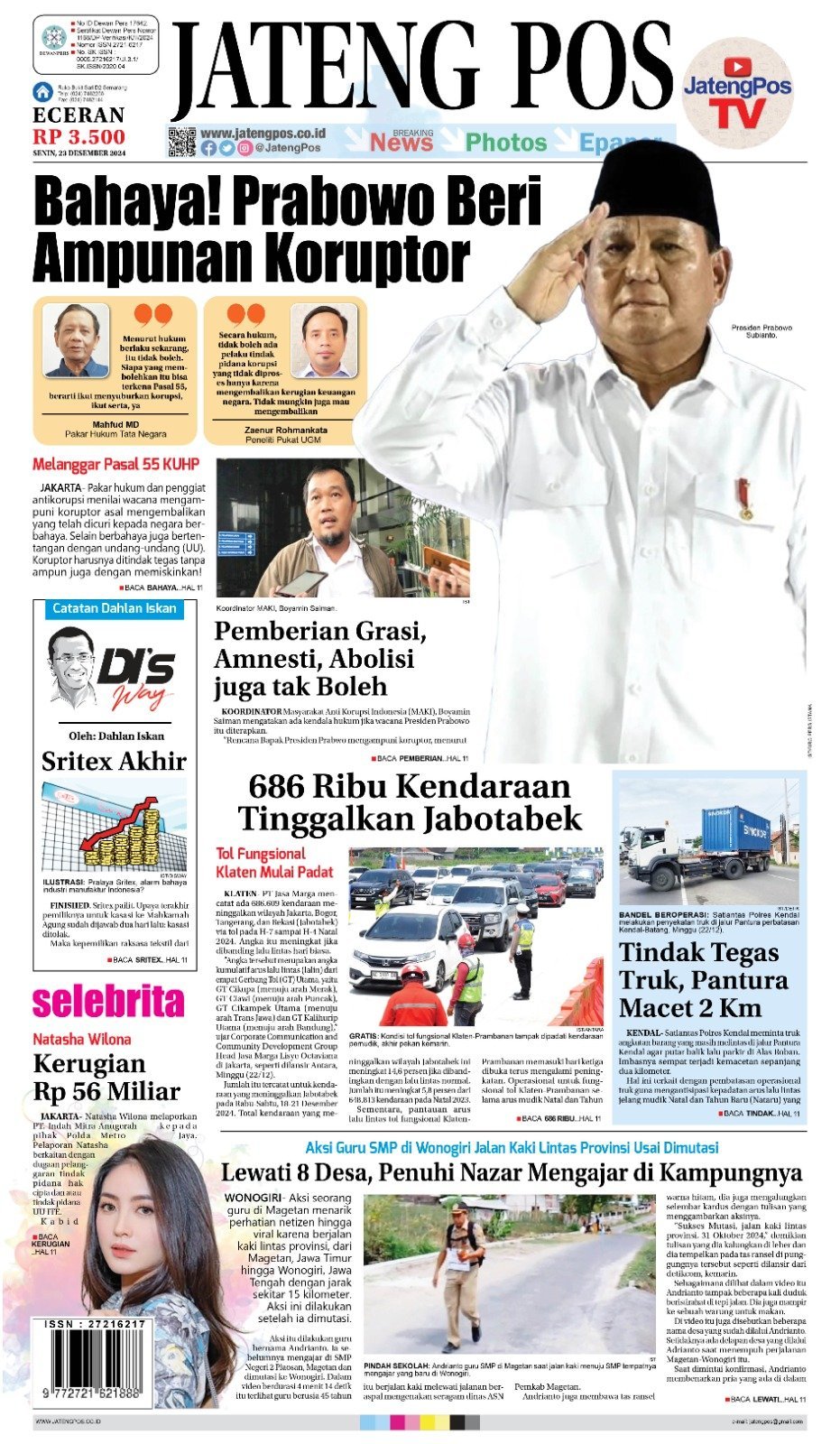 E-Paper Koran Jateng Pos, Senin 23 Desember 2024 Admin: Redaksi Senin, 23 Desember 2024 Bagikan Copy URL TERKINI Polrestabes Kawal Aksi Unjuk Rasa Anti Korupsi di Balai Kota, Berjalan Aman 24 Juni 2025 @18:11 BNNP Jateng Bongkar Jaringan Pengedar Narkoba di Tegal 24 Juni 2025 @18:02 Lebih dari 70.000 Mahasiswi Ikut Female Future Leader 1 24 Juni 2025 @17:57 Neo Sport Cafe CB650R Terbaru Tampil Makin Gagah dengan Teknologi Terkini 24 Juni 2025 @17:53 Pemprov Jateng Jalin Kerja Sama Kelautan dan Perikanan dengan Fujian 24 Juni 2025 @17:50