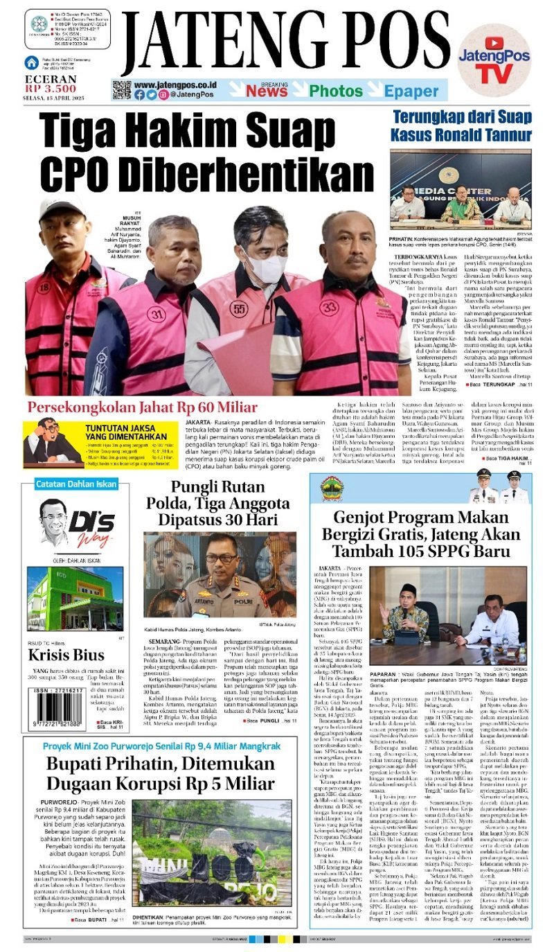 E-Paper Koran Jateng Pos, Selasa 15 April 2025 Admin: Redaksi Selasa, 15 April 2025 Bagikan Copy URL TagsE-Paper Koran Jateng PosSelasa 15 April 2025 TERKINI Polrestabes Kawal Aksi Unjuk Rasa Anti Korupsi di Balai Kota, Berjalan Aman 24 Juni 2025 @18:11 BNNP Jateng Bongkar Jaringan Pengedar Narkoba di Tegal 24 Juni 2025 @18:02 Lebih dari 70.000 Mahasiswi Ikut Female Future Leader 1 24 Juni 2025 @17:57 Neo Sport Cafe CB650R Terbaru Tampil Makin Gagah dengan Teknologi Terkini 24 Juni 2025 @17:53 Pemprov Jateng Jalin Kerja Sama Kelautan dan Perikanan dengan Fujian 24 Juni 2025 @17:50