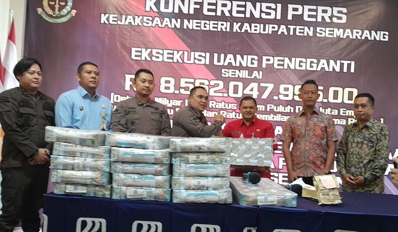 “Hari ini kami serahkan barang bukti uang pengganti kerugian tunai sebesar Rp 8.562.047.995,-. Penyerahan barang bukti ini kita laksanakan berdasarkan perintah pengadilan yang secara inkrah telah memvonis terdakwa hukuman penjara selama 1,5 tahun,” ujar Kepala Kejari (Kajari) Kabupaten Semarang Ismail Fahmi di Kantor Cabang BRI Ungaran, Kamis (23/1/2025).