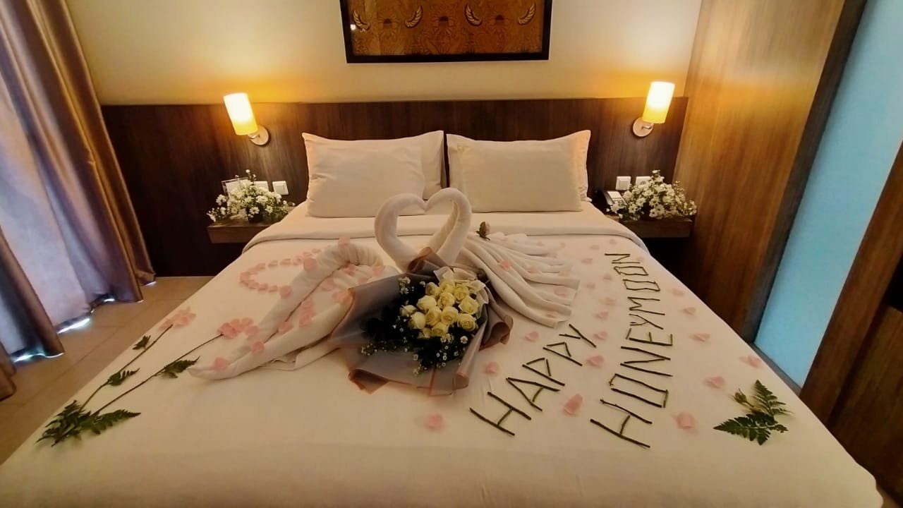Taburan bunga mawar berbentuk hati atau tulisan, hand bouquet serta animal towel bagi tamu yang merayakan bulan madu atau pernikahan. Dekorasi menawan dengan pelayanan prima menjadi bagian dari promo inap khusus yang ditawarkan manajemen Aston Inn Pandanaran Hotel Semarang.