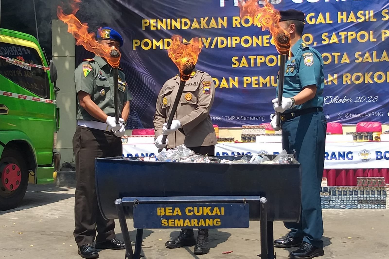 “Akibat tumpukan sampah di TPA Jatibarang Semarang sekarang ini terbakar, maka kami terpaksa memindahkan tempat pemusnahan barang bukti rokok ilegal yang sudah disetujui pihak kejaksaan ke PT Indosemen Cirebon”, ungkap Kepala Kantor Pengawasan dan Pelayanan Bea dan Cukai Tipe Madya Pabean A Semarang Bier Budy Kismulyanto.