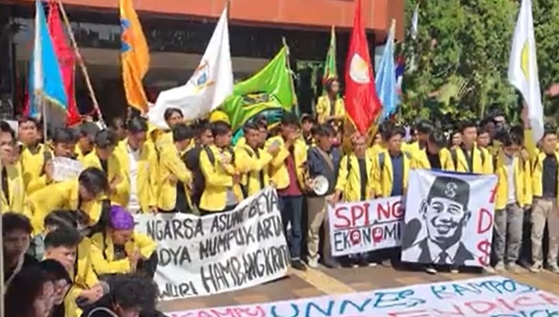 JATENGPOS.CO.ID, SEMARANG– Ratusan mahasiswa Universitas Negeri Semarang (Unnes) melakukan aksi unjuk rasa di depan gedung rektorat. Mereka memprotes kenaikan Iuran Pengembangan Institusi (IPI) tahun 2024 hingga ratusan rupiah.