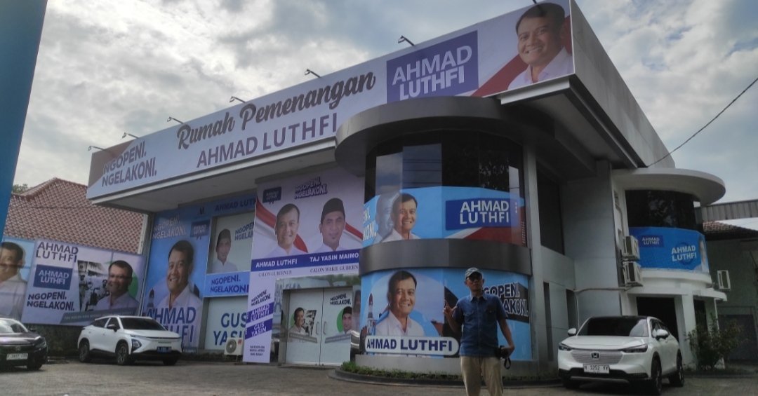 Posko Ahmad Luthfi- Taj Yasin berdiri megah di pinggir jalan persis. Bangunan ini seluas 1.770 m2, dua lantai. Dengan kapasitas parkir hingga 50 mobil.