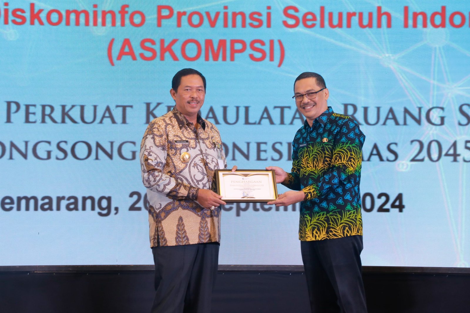 Penghargaan diserahkan Ketua Askompsi, Muhammad Faisal pada acara Seminar Nasional bertema “Ayo Kita Perkuat Kedaulatan Ruang Siber, Menyongsong Indonesia Emas 2045” di Hotel Patrajasa Kota Semarang, Kamis, 26 September 2024.