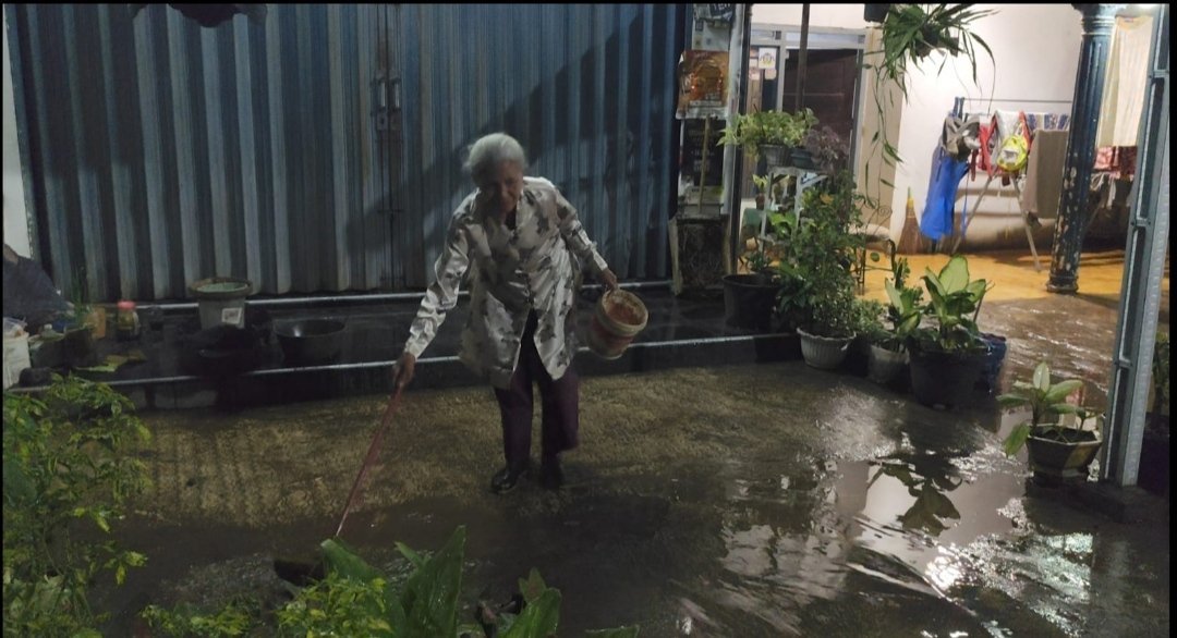 “Ini sudah berkali-kali, memang seperti ini setiap kali hujan deras. Sampai masuk rumah, ya segini ini,” ujarnya saat ditemui.