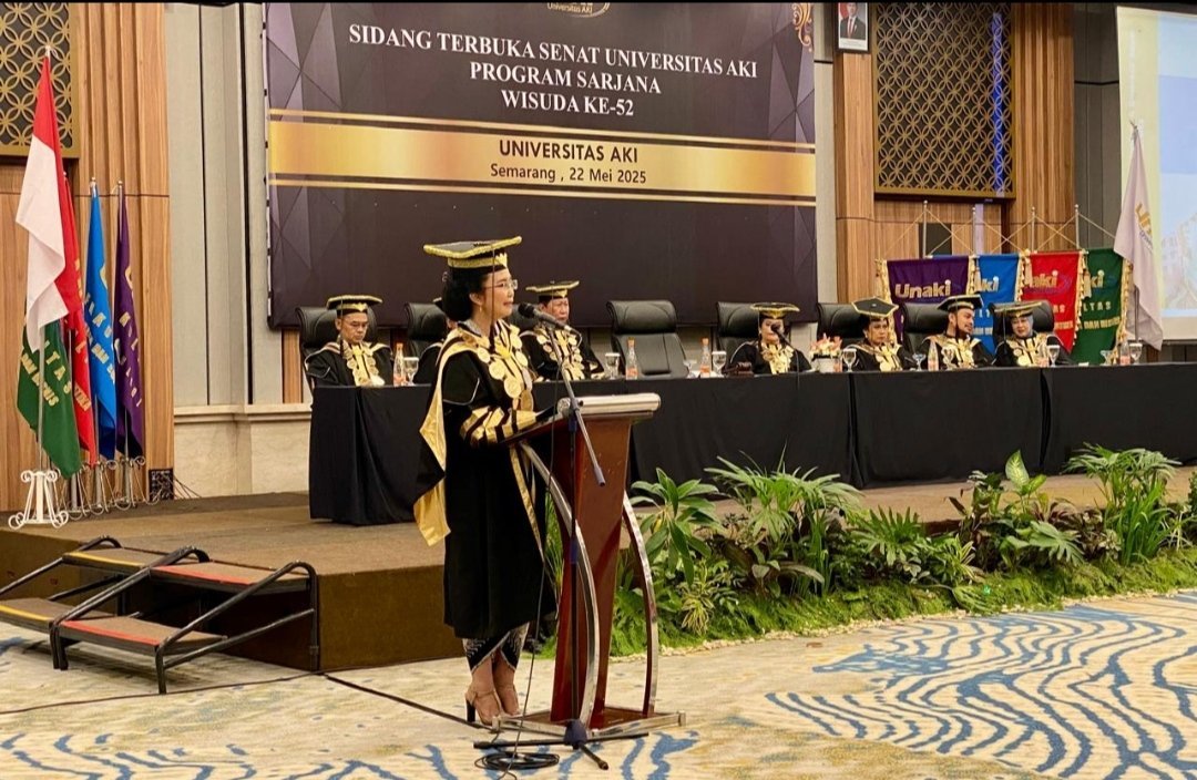 Rektor Universitas AKI Semarang, Prof. Dr. Tri Purwani, S.E., M.M. dalam sambutannya menyampaikan selamat kepada para lulusan dan menekankan pentingnya menerapkan ilmu yang telah diperoleh untuk kemajuan bangsa.