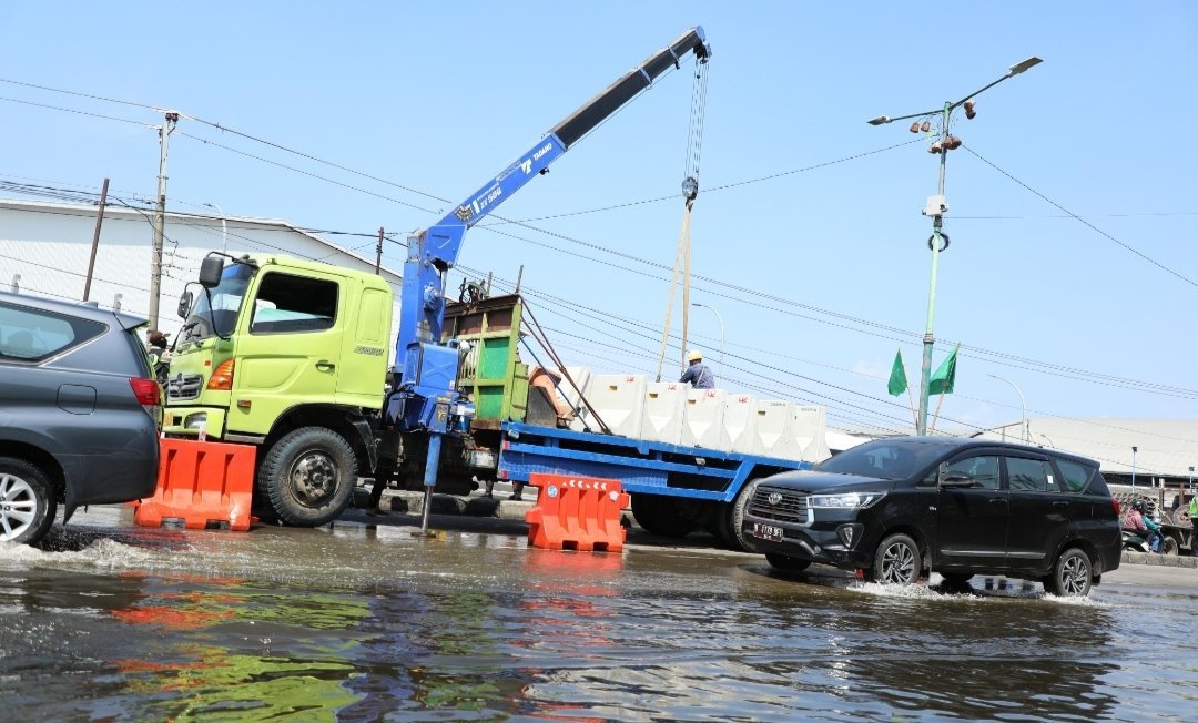 JATENGPOS. CO. ID, DEMAK- Penanganan banjir rob sayung terus berjalan. Kementerian Pekerjaan Umum mendukung upaya Pemerintah Provinsi Jawa Tengah memasang pembatas beton atau concrete barier pada U-Turn median jalan Jl Semarang-Sayung KM 9 (depan Polytron yang banjir menahun).